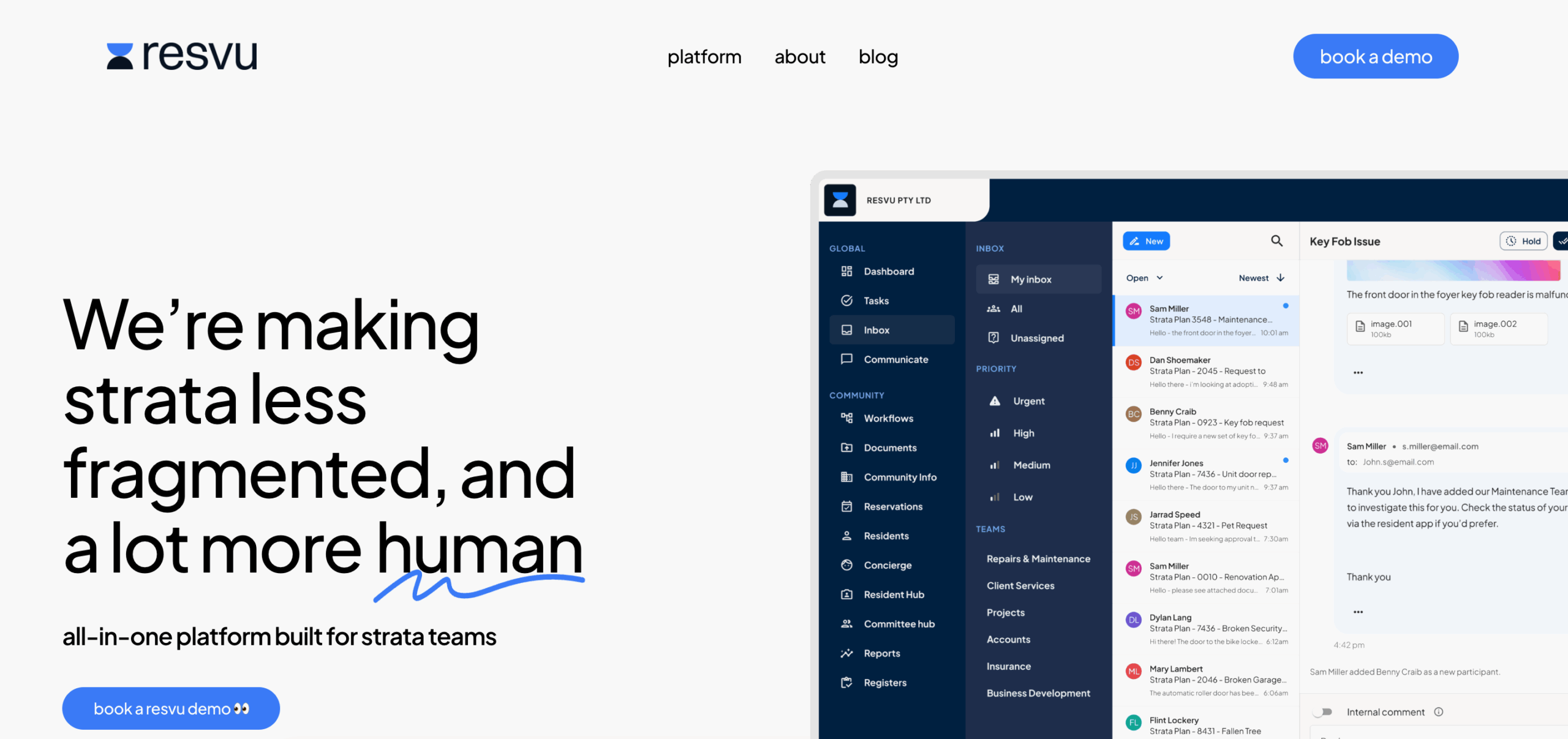 Resvu is a smart strata and property management platform designed to streamline communication, engagement and operational workflows. By centralising key tasks, documents and interactions, Resvu enables managers and committees to run buildings more efficiently while improving resident experience. The platform’s intuitive tools, automation features and real-time insights make it an essential solution for modern strata and community management.
